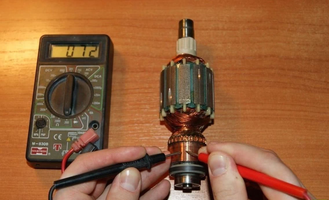 У ротора коллекторного движка много обмоток, но тестировать якорь легко. Проверка мультиметром двигателя коллекторного типа: