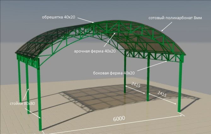- Арочной формы с параллельными верхним и нижним поясами. Арочные фермы из профильных труб востребованы при строительстве навесов для автомобилей, теплиц, беседок.