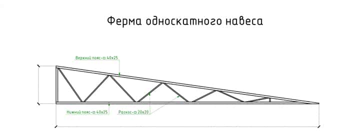 Фермы, угол уклона которых достигает порядка 22-30º. Чтобы такая конструкция была устойчивой, ее высота должна равняться 1/5 доли длины изделия или быть несколько меньше. Как правило, эту норму берут за основу при расчете необходимой высоты конструкции, то есть заданную длину изделия просто делят на 5. Предпочтительна такая разновидность фермы, если конструкция должна быть максимально облегченной. Если предполагаемая длина строения будет более 14 метров, то положение раскосов в конструкции фермы из профильной трубы для навеса будет вертикальным. Главное здесь — сделать правильный расчет навеса, учесть все нюансы. На верхнем ярусе фиксируются куски профиля длиной 150-250 см. В результате весь каркас будет состоять из двух поясов, с количеством панелей, кратным двум
