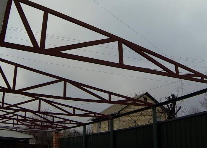 Создание и самостоятельная установка навесов возможны при небольших габаритах сооружения. Фермы для навесов в зависимости от конфигурации поясов могут быть изготовлены из профилей или стальных уголков. Для относительно небольших конструкций рекомендуется выбирать профильные трубы.