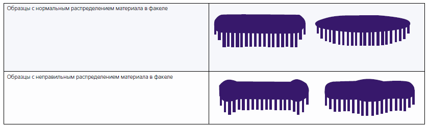 Для качественной и эффективной покраски материал должен распределяться равномерно или с незначительной концентрацией в центральной части факела. Образцы правильного и неправильного распределения материала приведены ниже.