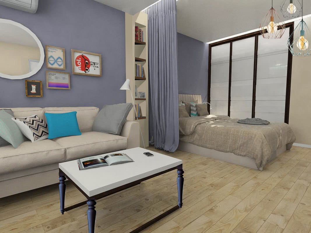 Стены лучше делать однотонными. Не приветствуются и крупные рисунки на шторах. Старайтесь избегать размещения на совмещенных метрах громоздкой мебели. Спальню – гостиную лучше оформлять в стиле минимализма.