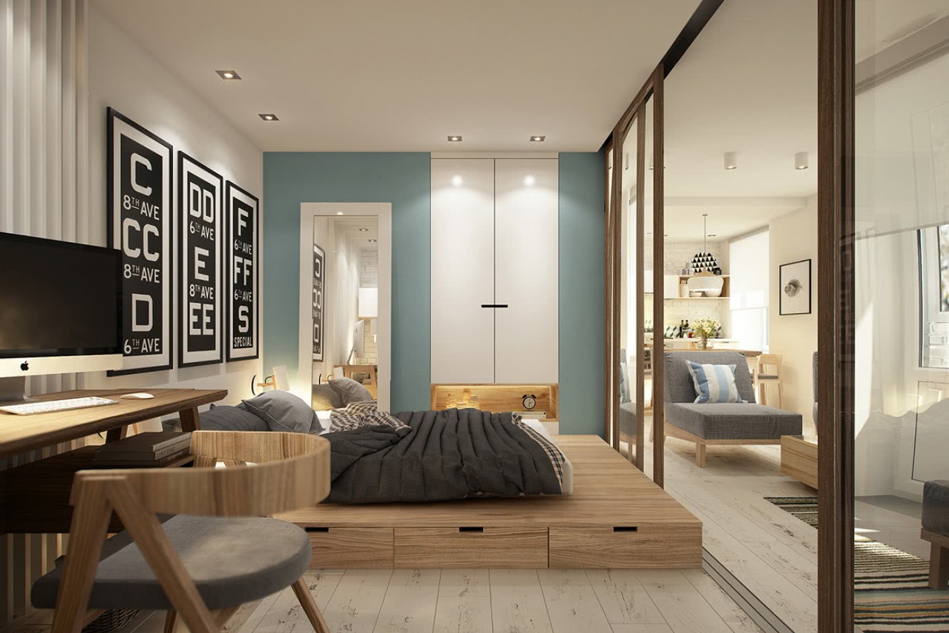Размышляя о том, как разделить однокомнатную квартиру на две зоны, следует помнить, что каждому жильцу надо предоставить место для повседневных занятий, а также для сна и отдыха. Требуется обустройство и системы хранения, которая не препятствует свободному перемещению.