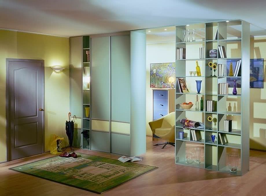 Шкаф перегородка для зонирования комнаты выполняет в помещении не только практическую функцию, но также может стать оригинальным дизайнерским элементом. В настоящее время существует много вариантов дизайна шкафов и стеллажей, которые подходят к тому или иному стилю. Некоторые модели содержат вмонтированный в конструкцию стол или кровать, поэтому используются для обустройства спальни, детской, рабочего кабинета.