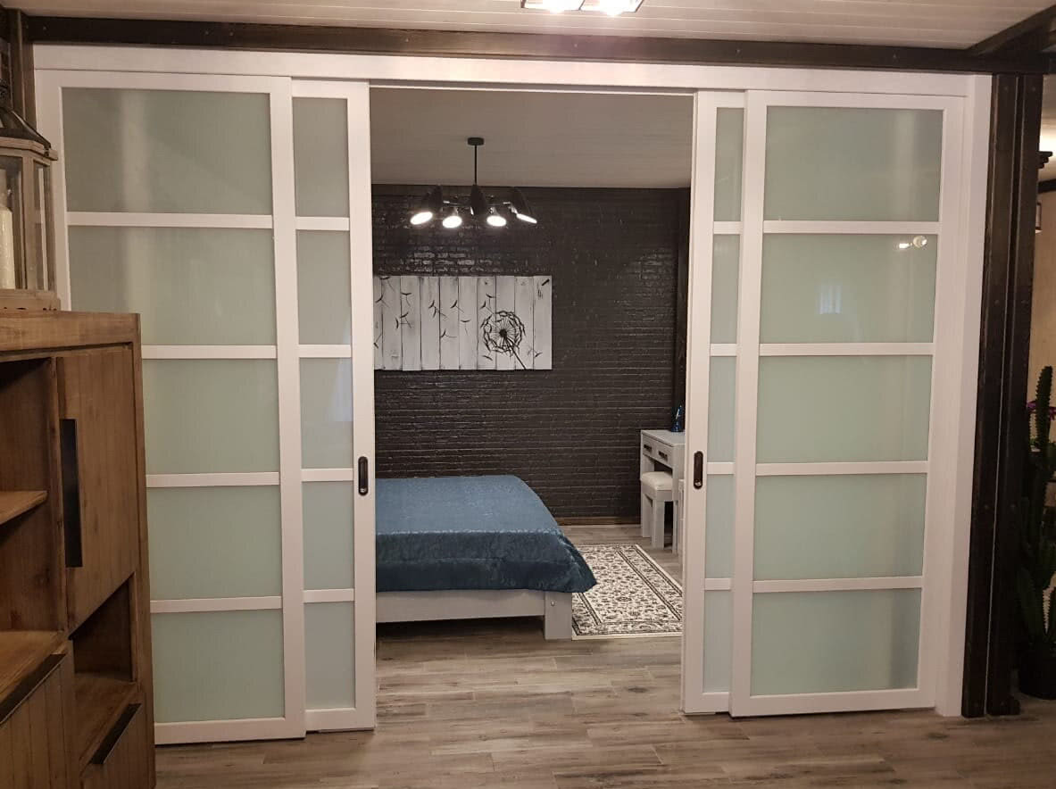 Конструкция, изготовленная по примеру шкафа-купе, закрывает часть помещения. Некоторые модели составлены из нескольких дверей, что придает им оригинальность.