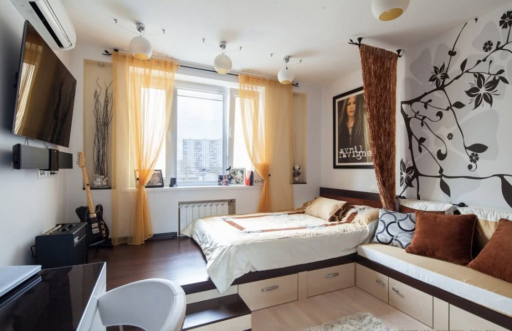 Проживая в просторной комнате, разделить ее на зоны оказывается проще всего. Плюс в том, что образуются две раздельные комнаты, причем с отличной звукоизоляцией.