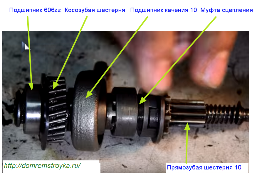 Чтобы разложить сам вал, потребуется вынуть шайбу, компрессионную и кольцевую пружины, стальной шар, шестеренку прямозубую. А с внутренней полости устранить металлическое и резиновые (2 шт.) кольца, кольцевую пружину, колечко, плоскую шайбу из металла.
