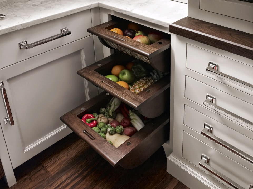 В выдвижных ящичках храните все необходимые предметы. Кухонную утварь, редко используемую, можно положить в дальние ящики
