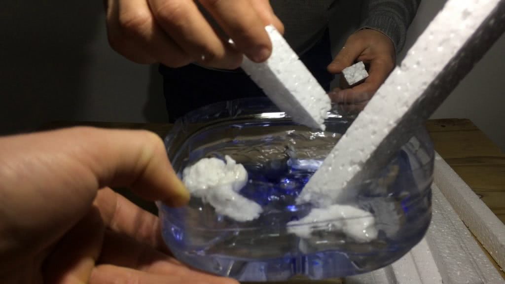 Сам процесс изготовления клея из пенопласта и бензина выглядит следующим образом: