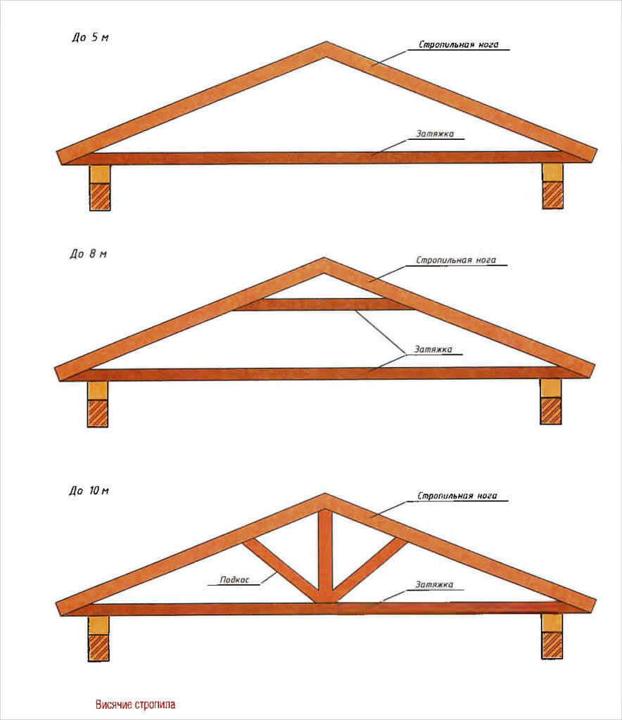 Висячие стропила монтируют при пролетах дома 6-14 м. Опираясь только на наружные стены, несущие балки воспринимают значительные распирающие усилия. Чтобы их распределить, в конструкцию вводят дополнительные горизонтальные и вертикальные элементы — ригели, затяжки, бабки (стойки, опирающиеся на затяжку).