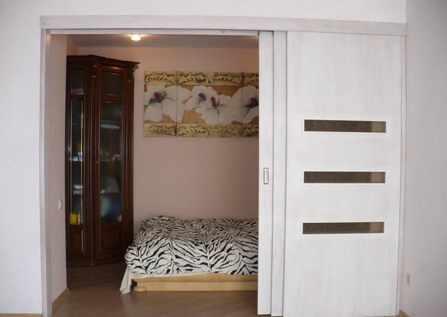 - откатные. Они устроены по принципу дверей в шкафах-купе и могут состоять из двух и более секций. Обычно ширина створок составляет 80 см и более. В зависимости от конструкции они могут быть подвесными — рельс находится только сверху — и опорными — рельс есть сверху и снизу. Такие перегородки легко монтировать, они имеют небольшой вес. Недостаток их в том, что нижний рельс быстро загрязняется, а звукоизоляция у таких конструкций невысокая. Кроме этого, надо предусмотреть место, куда будут убираться створки такой перегородки при их сдвигании;