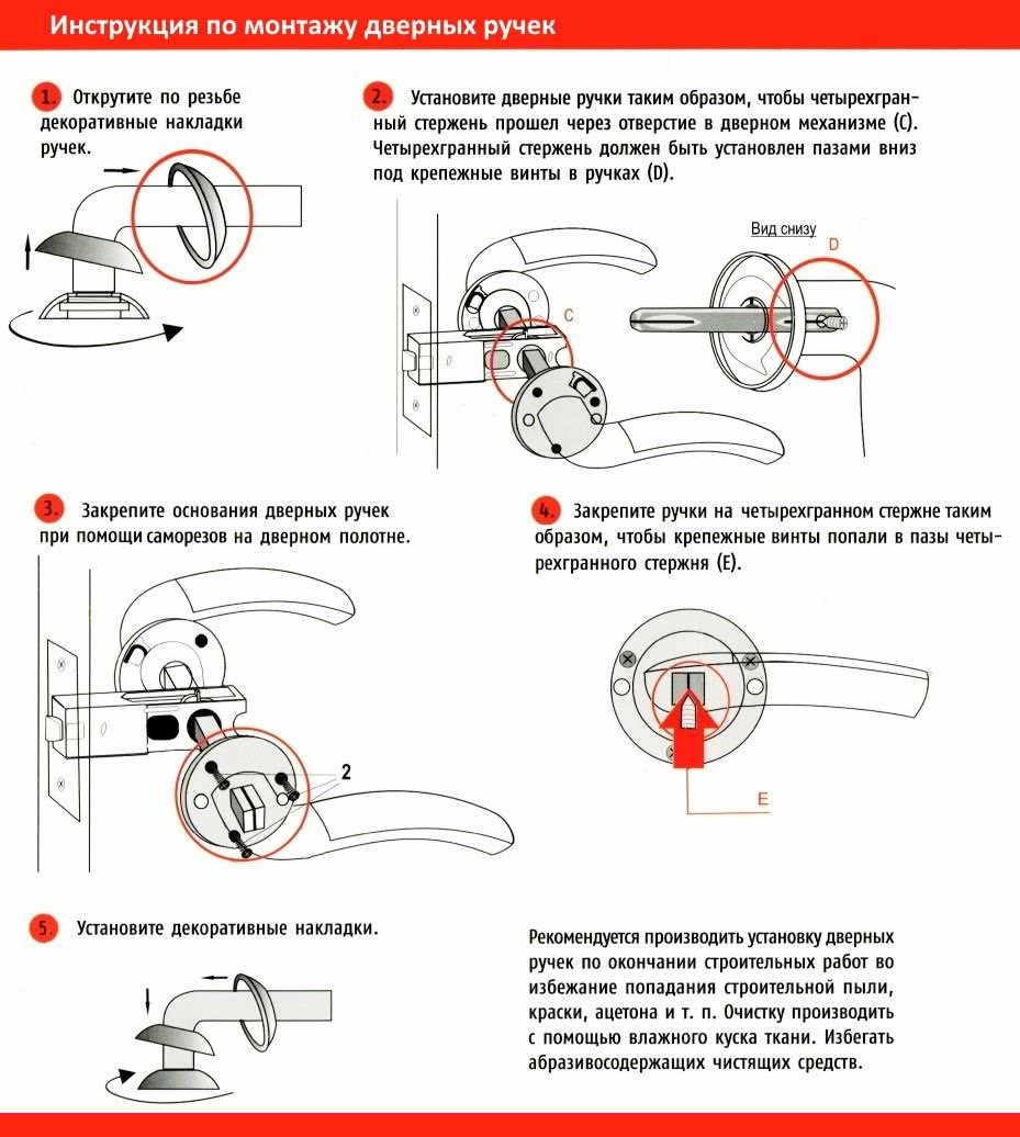 Механизм ручки прикручивается к дверям саморезами, но чтобы крепежная шайба не портила вид, она прикрывается декоративной накладкой, после чего устанавливается ручка.