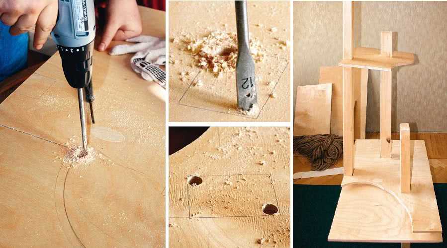 - Собрать игровой комплекс можно из дерева и металлических креплений. В качестве когтеточки тут применяют небольшое бревнышко, которое оклеивается бечевкой.