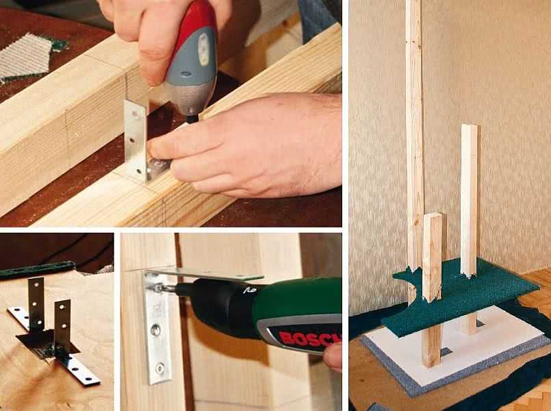Столбов в выбранной конструкции три: один 220 см, второй — 120 см и третий — 80 см. Они будут крепиться к основе из фанерного листа. На основании надо разместить столбы так, чтобы самый длинный был поближе к стене. Чтобы не перепутать, при разметке на листе, при помощи линейки и карандаша, сначала нарисовали трафарет на бумаге, на котором было нанесено расположение столбов относительно друг друга. С готового макета перенесли разметку для установки столбов. Их крепили длинными гвоздями через основу (по 4 штуки), просверлив в фанере отверстия чуть меньшего диаметра. Затем их снаружи закрепили уголками 55*20 для большого столба и 35*40 для меньших.
