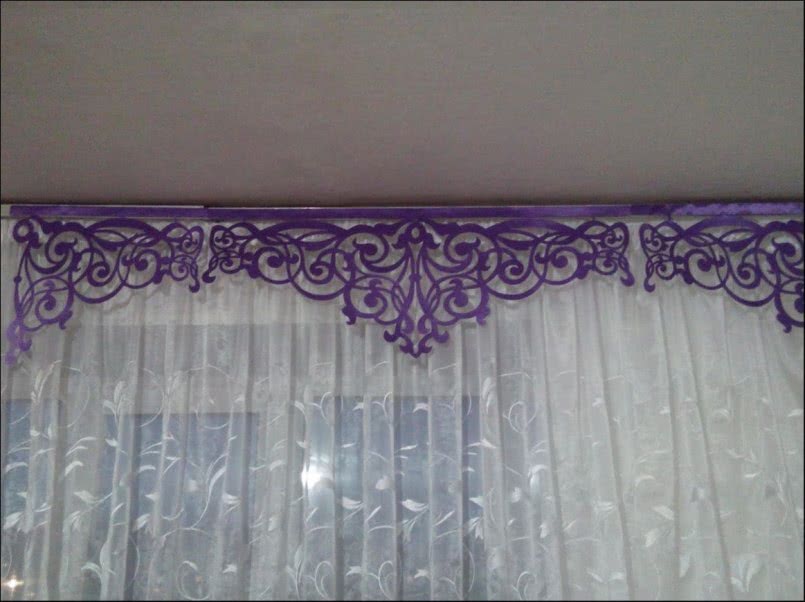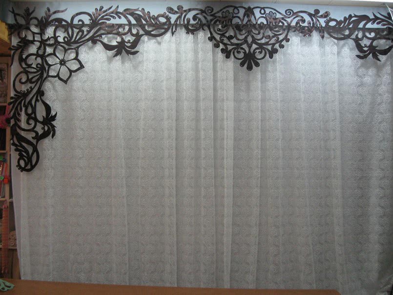 Деревянный ажурный ламбрекен по трафарету вырезается с помощью резцов и стамесок. Несмотря на эффектность, он уместен не в каждом дизайне. Это вечный элемент, который устанавливается всего один раз. Для этого покупается карниз, к которому деталь может надежно зафиксироваться.