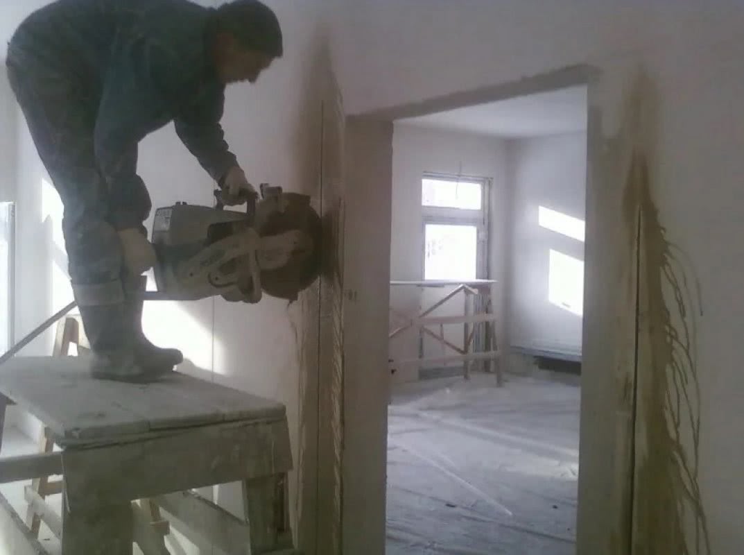 Этот способ отличается своей точностью и аккуратностью, после среза лишнего материала дополнительная работа не требуется. Отрицательным моментом является то, что толщина стены не всегда позволяет сделать разрез полностью. Приходится повторять тоже самое с обратной стороны, поэтому высока вероятность несовпадения разрезов.