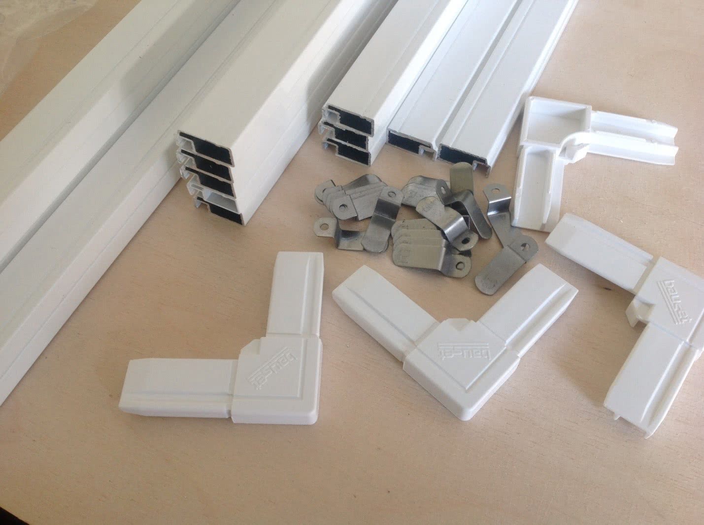 На фото представлен алюминиевый профиль, пластиковые вставные уголки и Z-образный крепеж для фиксации рамки в проеме с помощью винтов.