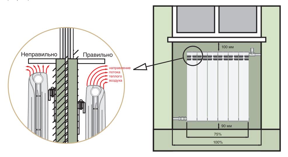 - Чтобы обеспечить эффективный воздухообмен, следует придерживаться следующих параметров: расстояние до пола – от 60 мм, до подоконника — от 100 мм.