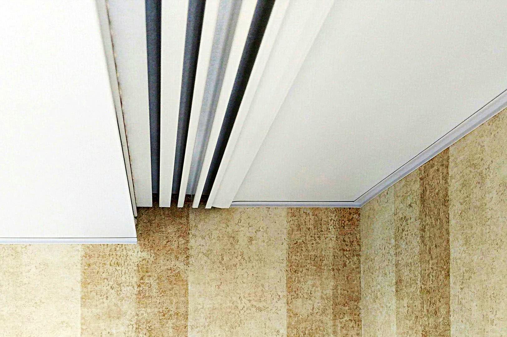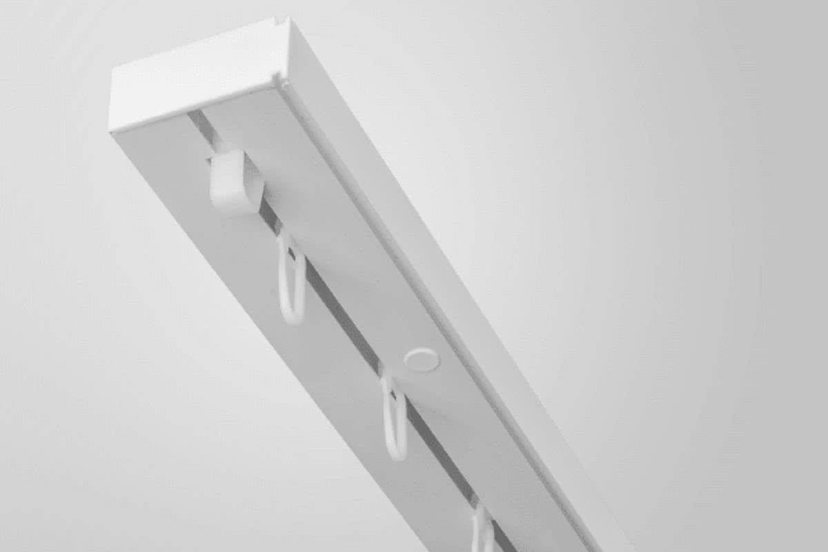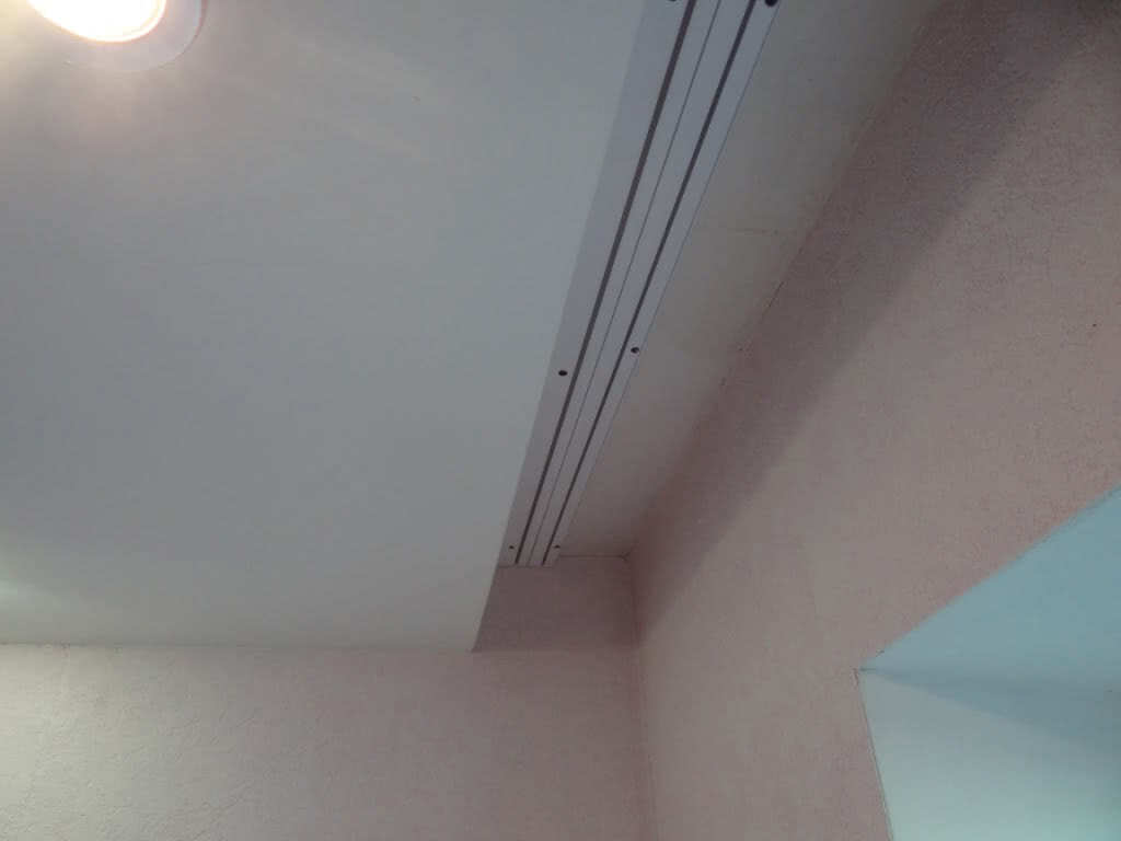 - Профильная конструкция – это направляющая, в которой есть паз для бегунков. Конструкции этого типа делают из пластика или алюминия. Они бывают однорядными и многорядными (до 4 рядов). Сегодня выпускаются прямые и изогнутые конструкции. Они сравнительно легкие, благодаря чему крепятся не только к стенам, но и к натяжным, гипсокартонным и деревянным потолкам.