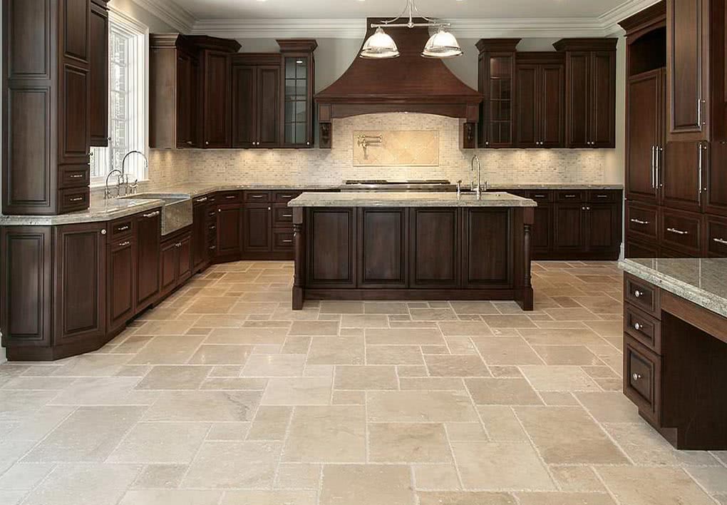 Темный пол будет выгодно смотреться в просторной комнате, оттеняя светлую мебель. Для кухни в классическом стиле подойдет покрытие, имитирующее натуральный камень.