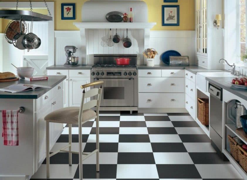 Керамогранит, кафель и кварцвинил – одни из самых практичных материалов для отделки пола в кухне. Их эксплуатационные характеристики полностью отвечают особым условиям этого помещения – высокая проходимость, перепады температур, влажность, высокая загрязняемость.