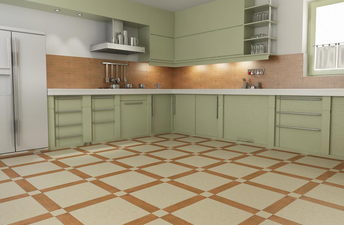 Выбор расцветки напольного покрытия зависит от общего кухонного дизайна, а также от цвета кухонного гарнитура. Наиболее популярные решения и идеи, пример:
