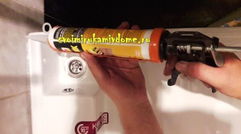 Чтобы брызги из раковины не стекали по стене, место соединения стены с раковиной желательно промазать герметиком.