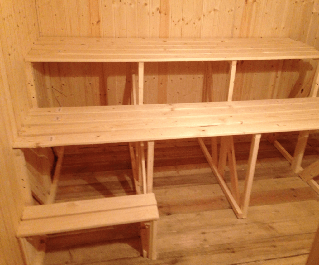 Там я разместил полки такой длины, чтобы на них можно было вытянуться во весь рост. Это привело к тому, что пришлось покупать дорогую печь и дорогую вагонку.