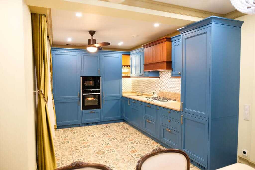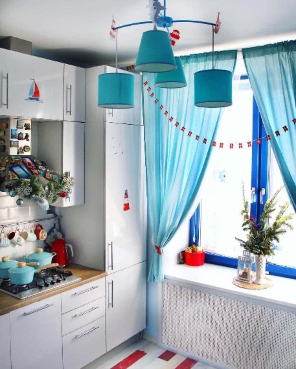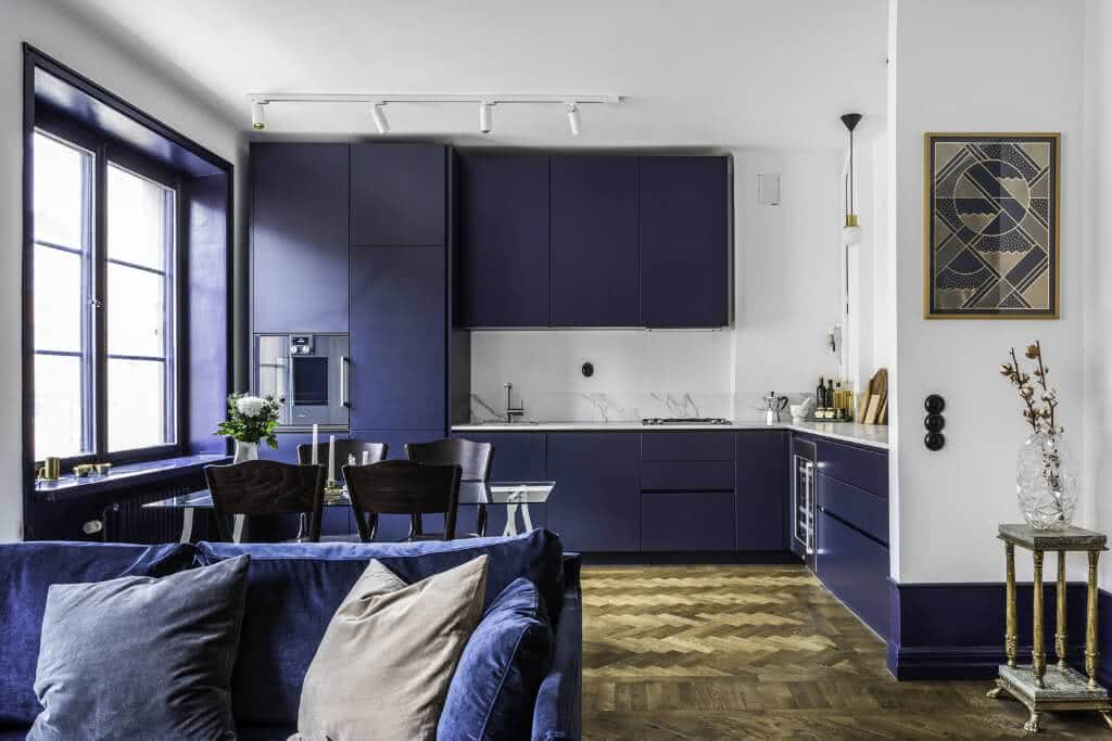 Чтобы сделать интерьер маленького помещения воздушным и легким, обязательно дополните синий белым. Этот цвет визуально сделает комнату более просторной.