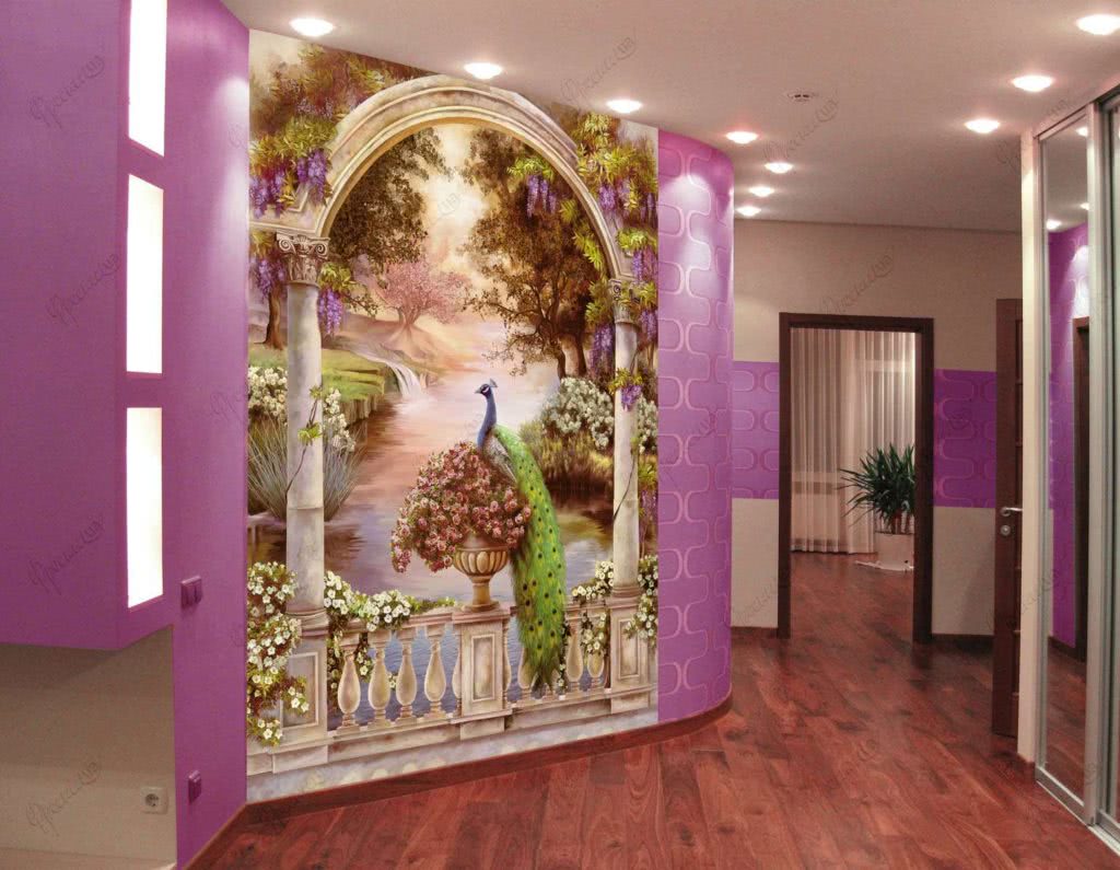 Увеличить вид комнаты помогают изображения архитектурных строений. Античные здания с высокими колоннами визуально поднимут потолки ввысь. Не рекомендуется выбирать изображения темных оттенков и мрачной направленности (готические соборы).