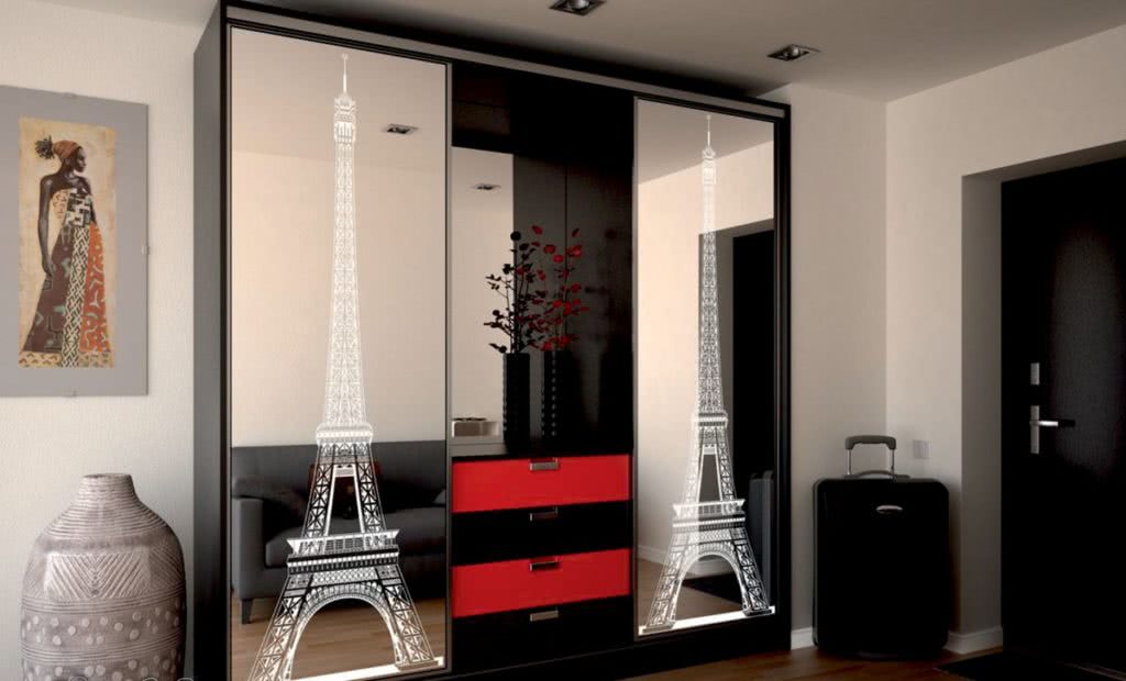 Современные технологии позволяют наносить рисунок на фасады мебели, на зеркала паркетную доску. Такое оформление визуально изменит коридор, добавит ощущение воздуха и пространства, чего не хватает прихожим.
