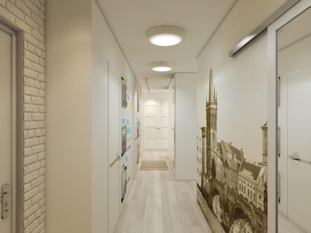 Для длинных и узких пространств используют трехмерные изображения водопадов, городских улиц или бескрайних полей. Освещение необходимо использовать точечное, настенное, желательны геометрические рисунки, расположенные поперек .