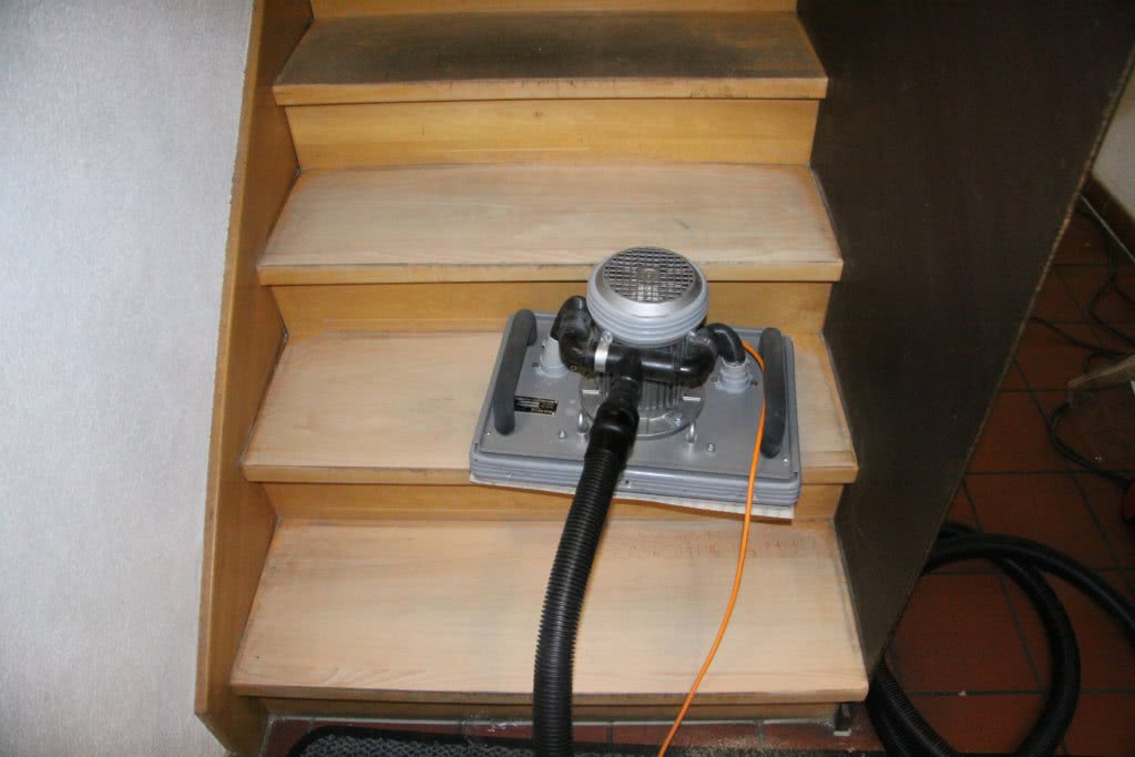По окончании подготовки поверхности следует удалить всю древесную пыль. Для этого можно использовать обычный пылесос. После этого лестницу следует протереть чуть влажной ветошью (иначе можно залакировать фрагменты пыли, которые со временем отойдут вместе с лаком). И, естественно, дать дереву подсохнуть.