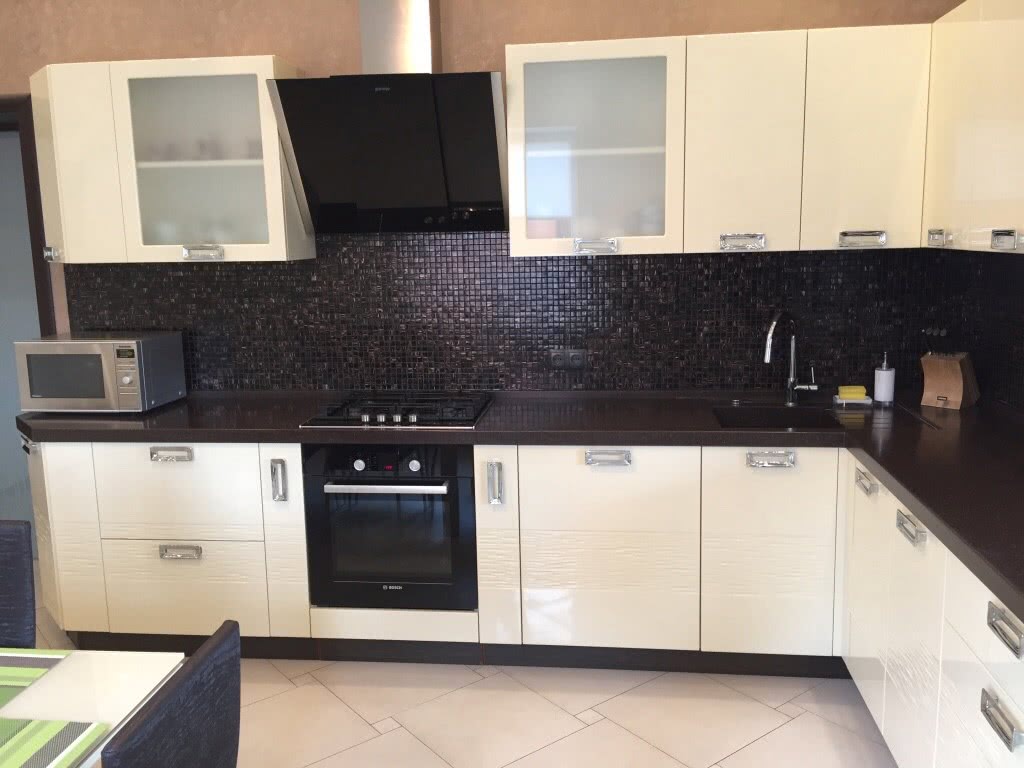 Нейтральный и очень благородный цвет, оптимально подходящий для кухни любого размера и стиля. Он очень популярен среди хозяек. Благодаря теплому оттенку, такие фасады создают в помещении спокойную атмосферу. Лучше всего бежевый подходит для кухни классического стиля.