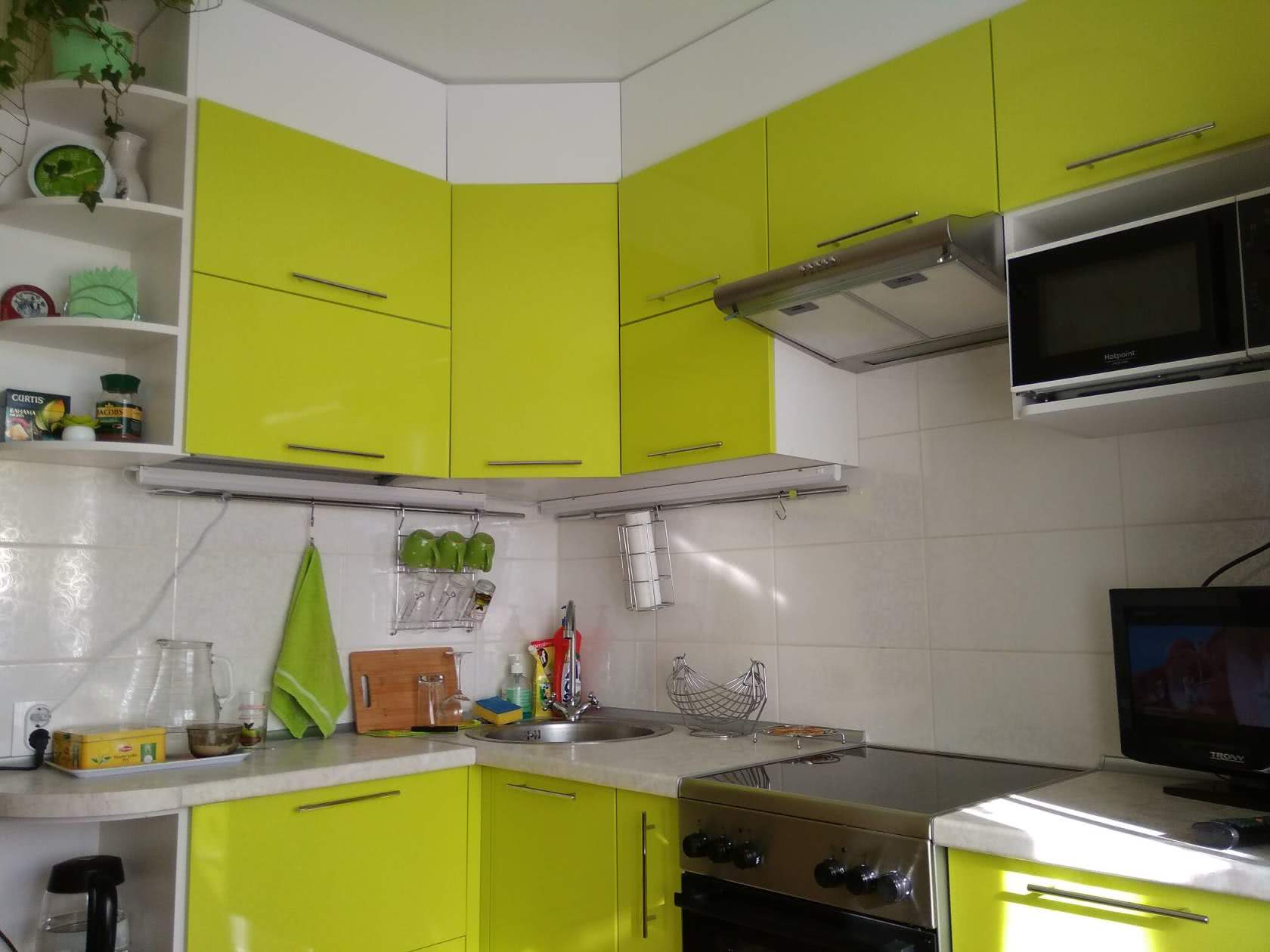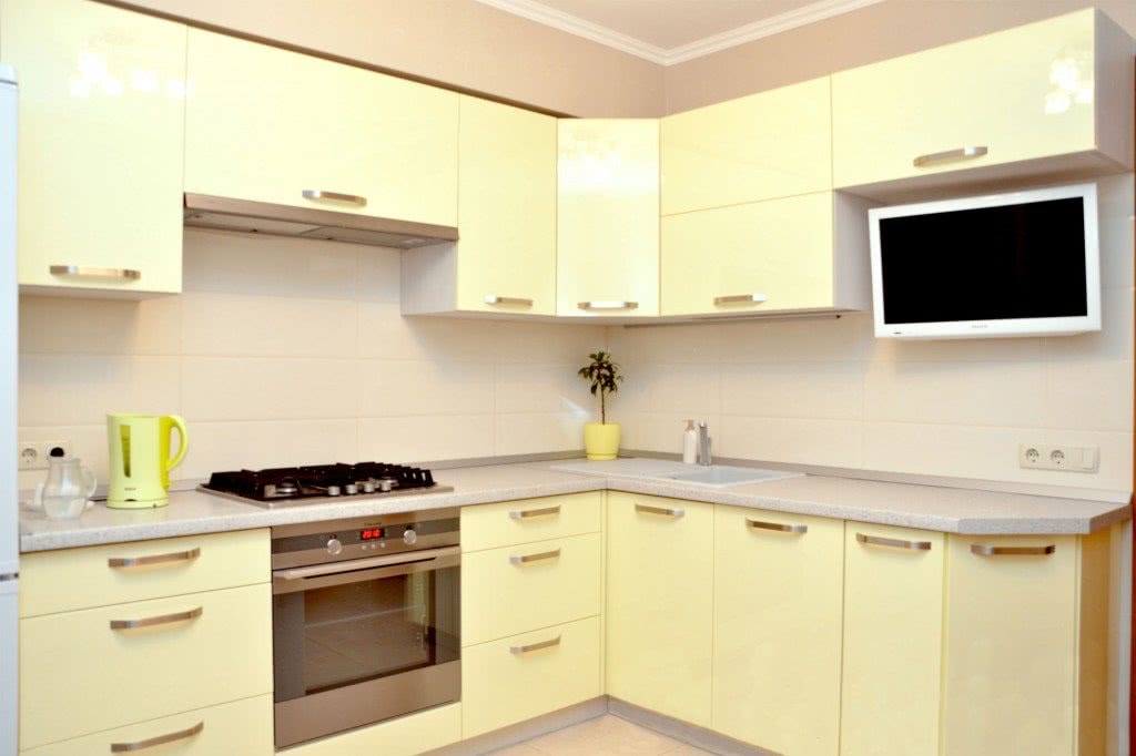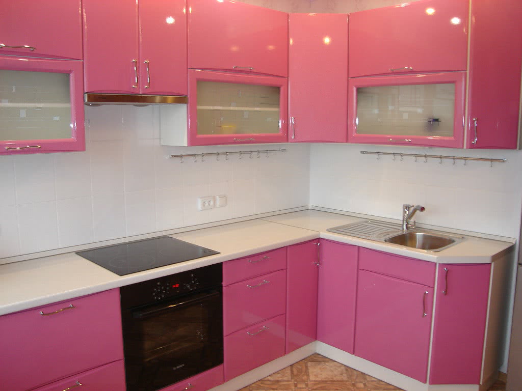 Фасады гарнитура для маленькой кухни предпочтительнее выбирать глянцевые. Они добавят помещению света и сделают его визуально намного просторнее. Этим же задачам поспособствуют стеклянные и зеркальные вставки.