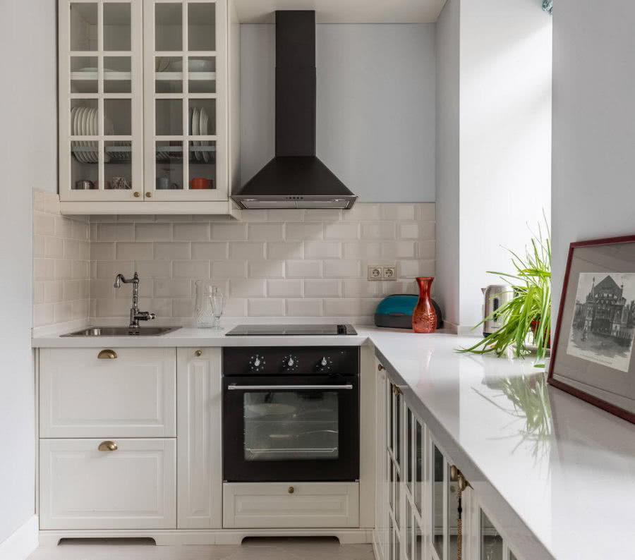 Иногда на белоснежной мини-кухне можно поставить темные предметы интерьера. К примеру, черный шкаф можно повесить на белой стене, а ящик для столовых приборов такого же цвета посреди двух белых.