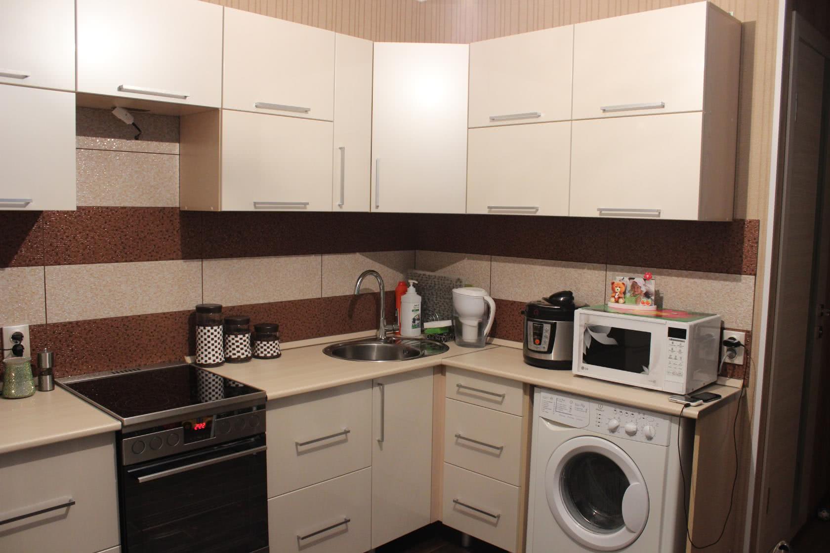 Порой в проем между частями столешницы устанавливаются такие бытовые приборы, как стиральная или посудомоечная машина. Белые бытовые приборы особенно удачно впишутся в композицию светлой кухни.