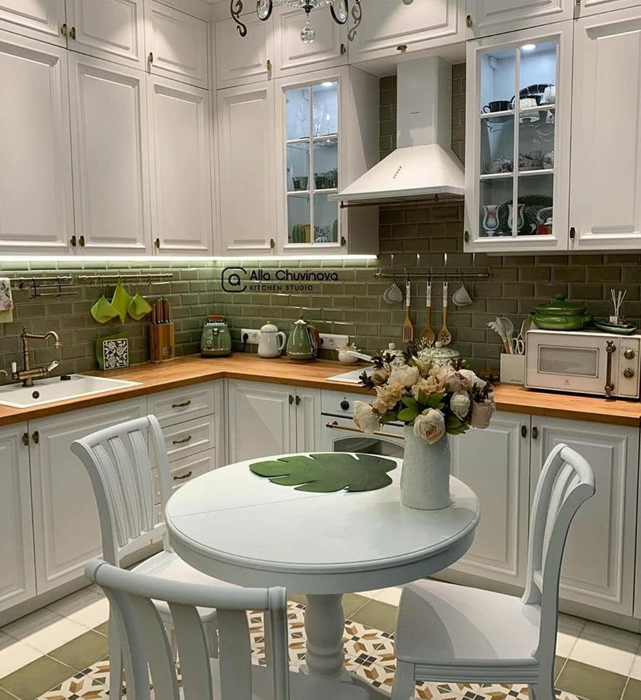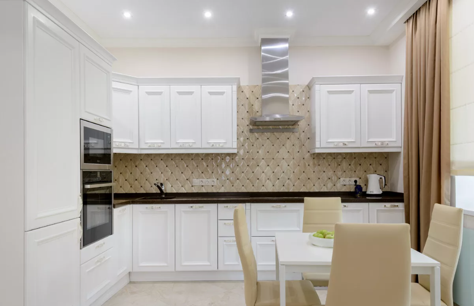 Есть дизайны, которые предполагают белые или кремовые кухонные шкафы и простые архитектурные детали. Такие элементы, как освещение, мебель и декор способны придать классической кухне больше индивидуальности.
