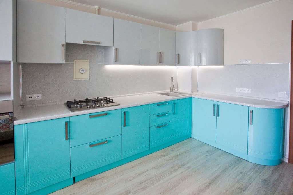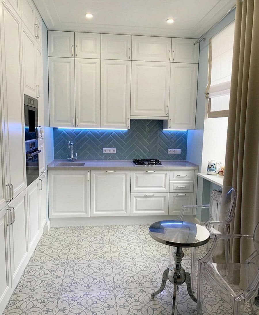 Если окна выходят на юг, сделать кухню прохладнее позволит использование в дизайне сине-голубых цветов.