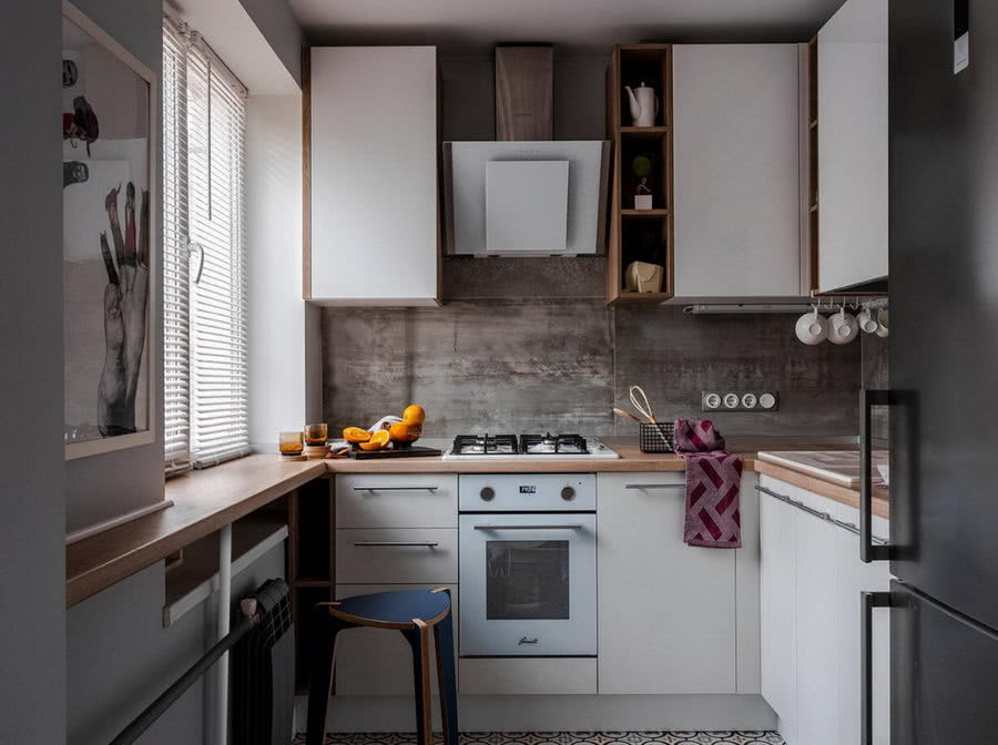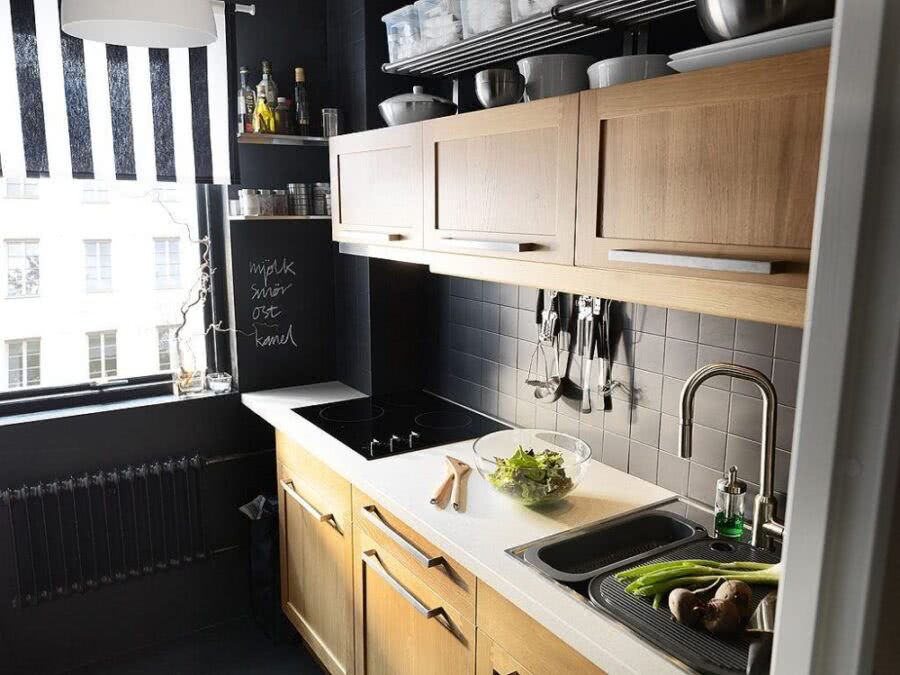 Маленькая кухня требует опытного размещения всего оборудования. Кухонная мебель должна быть устроена так, чтобы можно было удобно готовить еду. Наиболее популярным является L-образное расположение, поэтому мебель расположена на двух стенах, что обеспечивает легкий доступ к холодильнику, раковине и плите. L-образное пространство достаточно универсально, чтобы вы могли легко использовать его в помещениях с особыми требованиями (например, в узкой кухне).