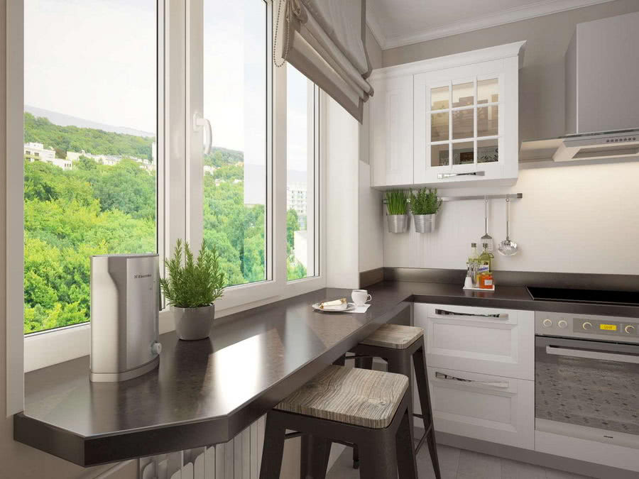 Это сравнительно новый, но уже ставший популярным среди владельцев маленькой кухни прием. Площадь подоконника расширяется и становится продолжением столешницы.