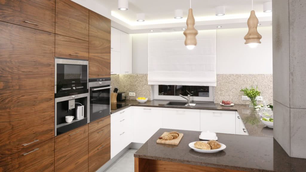 Современные кухни не должны быть резкими или холодными. В их интерьер лучше добавить естественных элементов, таких как деревянный потолок. Получится создать теплую обстановку в помещении.