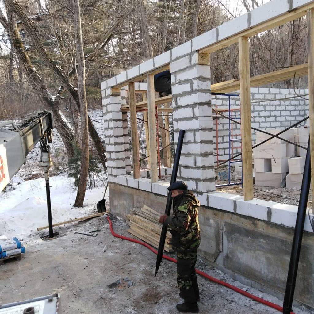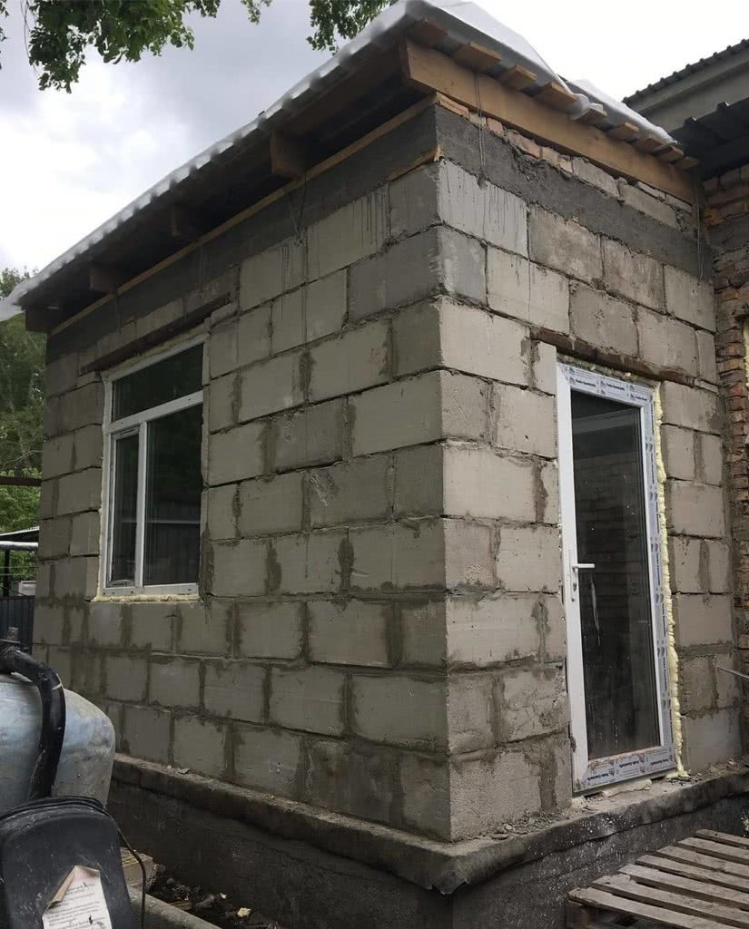 При этом отдельные шлакоблоки обрезаются по требуемым размерам, чтобы осталось пространство под окно или дверь.