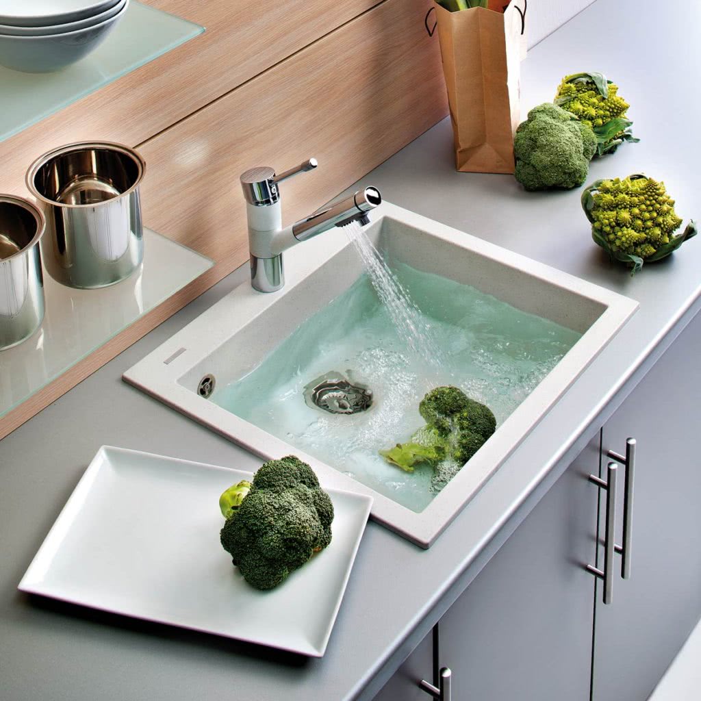 На керамической раковине можно даже нарезать овощи, ее поверхность не будет поцарапана. Кроме того, ее легко чистить, она очень устойчива к температуре и обесцвечиванию. К сожалению, этот продукт стоит гораздо дороже, чем модель из нержавеющей стали.
