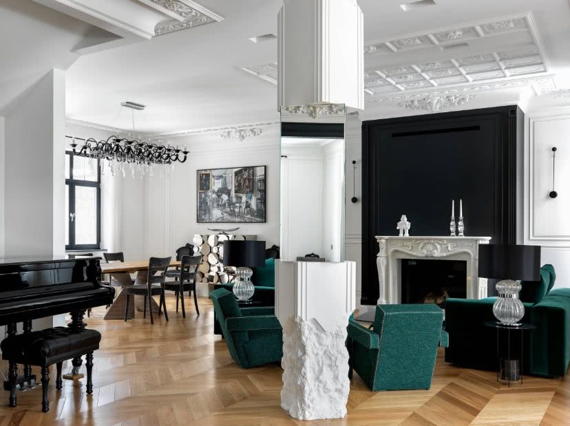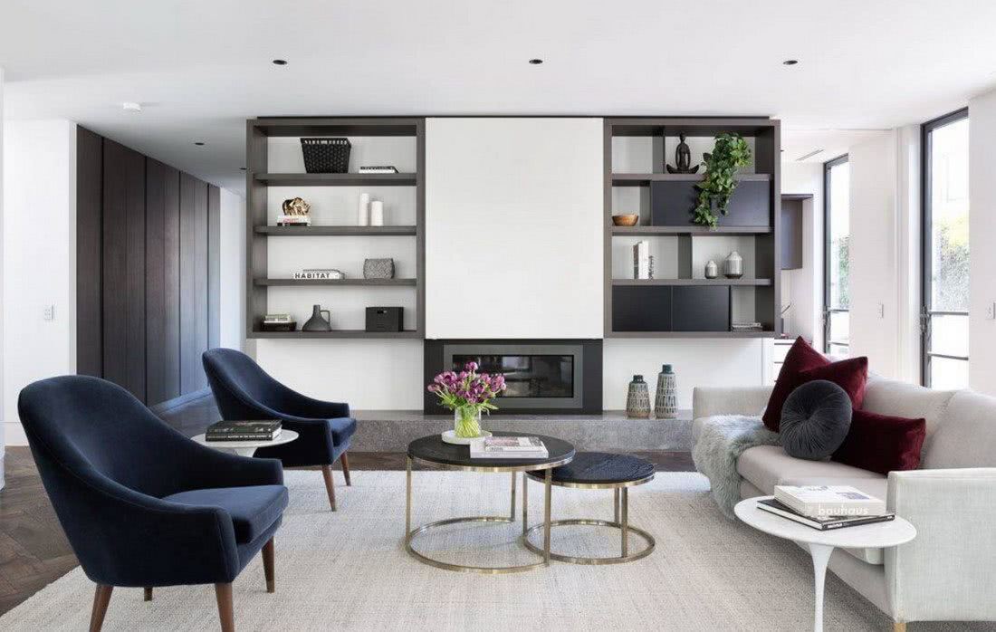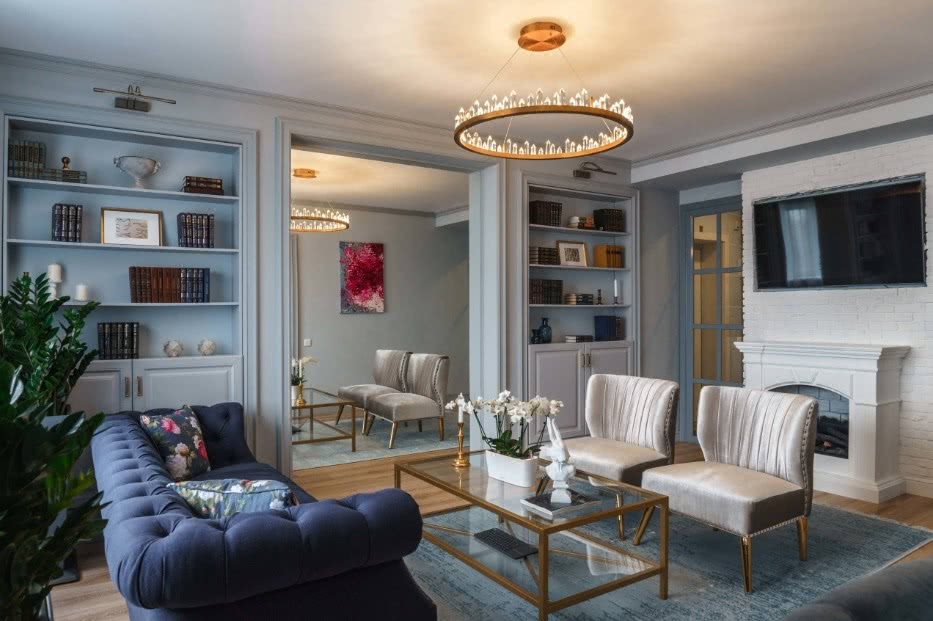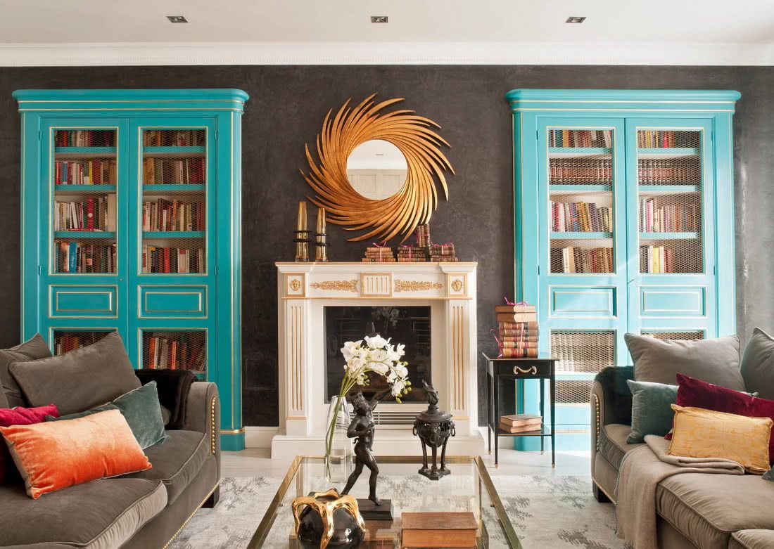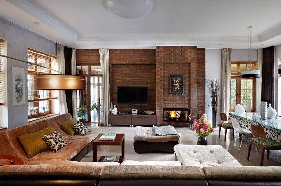 В современном мире стиль модерн в основном заключается в сочетании спокойных оттенков с контрастными тонами, а также простоте и рациональности. Кроме того, нередко в такой гостиной используется большое количество зеркал и стеклянных акцентов. Все это помогает визуально расширить пространство. Чаще всего такое оформление можно увидеть в частном доме. Ведь только в большой комнате можно установить камин по центру, тем самым сделав его главным очагом в доме. Если модерн был выбран для оформления квартиры, используйте фальш-камин. Но помните, что в таком случае топка должна быть ярко-выраженной с имитацией пламени и дров.