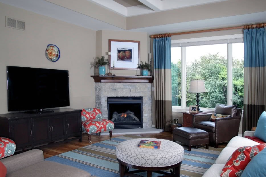 Сочетание камина с современной техникой – это спорный вопрос. Конечно же, в идеальном варианте интерьер гостиной с камином предполагает отсутствие телевизора. Ведь в таком пространстве надо наслаждаться общением и совместным времяпрепровождением вместе с близкими людьми. Но если другого варианта нет, то лучше всего разместить их на одной линии. Альтернативным вариантом будет приобретение углового камина. В таком случае телевизор будет расположен не рядом с ним. Благодаря этому, при желании можно будет наслаждаться теплом камина и в то же время смотреть любимый фильм.