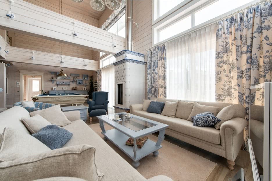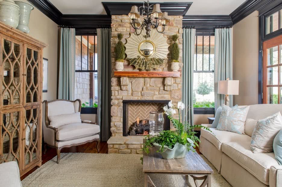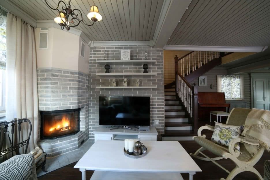 Оформление гостиной в стиле прованс до сих пор несет в себе отпечатки южных стран. Легкий оттенок старины в сочетании с романтикой позволяет создать действительно удивительный интерьер. Отделка камина в данном случае преимущественно выполнена в виде открытого кирпича. Кроме того в таком помещении всегда есть много деталей с цветочным принтом. Чаще всего стиль прованс используется для загородного дома или дачи, а в городских квартирах его реализуют крайне редко.