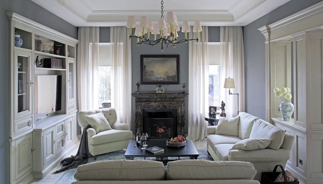 В основном гостиные с камином оформляют в классическом стиле. Выглядит это невероятно красиво, изысканно. Только представьте, светлые стены, элегантная мебель из дерева, роскошный диван, лепнина, довольно большая люстра. Не удивительно, что в таком интерьере камин будет выглядеть наиболее уместно. Что касается его оформления, то чаще всего фасад выполнен из камня или дерева, а декор при этом отсутствует. Это позволяет добиться элегантной сдержанности. В основном над таким камином расположено крупное зеркало, картина или же полки с декоративными предметами.