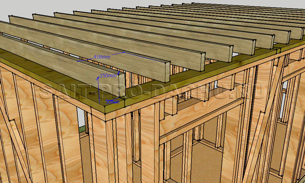 Обратите внимание, фронтонные стропила прибиты по самому краю стены, тогда как остальные сразу за лагами. А сейчас вернемся к этим самым лагам