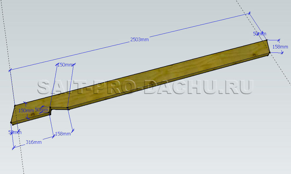 В качестве такового может выступить обычная обрезная доска сечением 160×50 мм, установленная на стойках из доски сечением 150×50 мм и длинной 640 мм. При общей высоте конструкции 800 мм над обвязкой обеспечивается угол ската в 18,5°, что вполне приемлемо для большинства современных укрывных материалов.